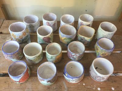 More little whisky sippers. I am still doing major studio clean up before I move back downstairs to my real workspace. Meanwhile these little guys are a good way to keep my hand in decorating, although they are not speedy. They make great kiln fillers. Majolica glazes are extremely stable so thes can be tucked into all sorts of nooks and crannies.